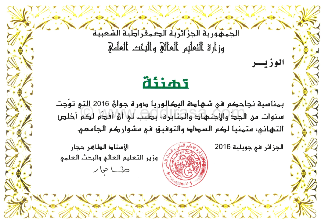 - رسالة تهنئة شخصية من وزير التعليم العالي والبحث العلمي.