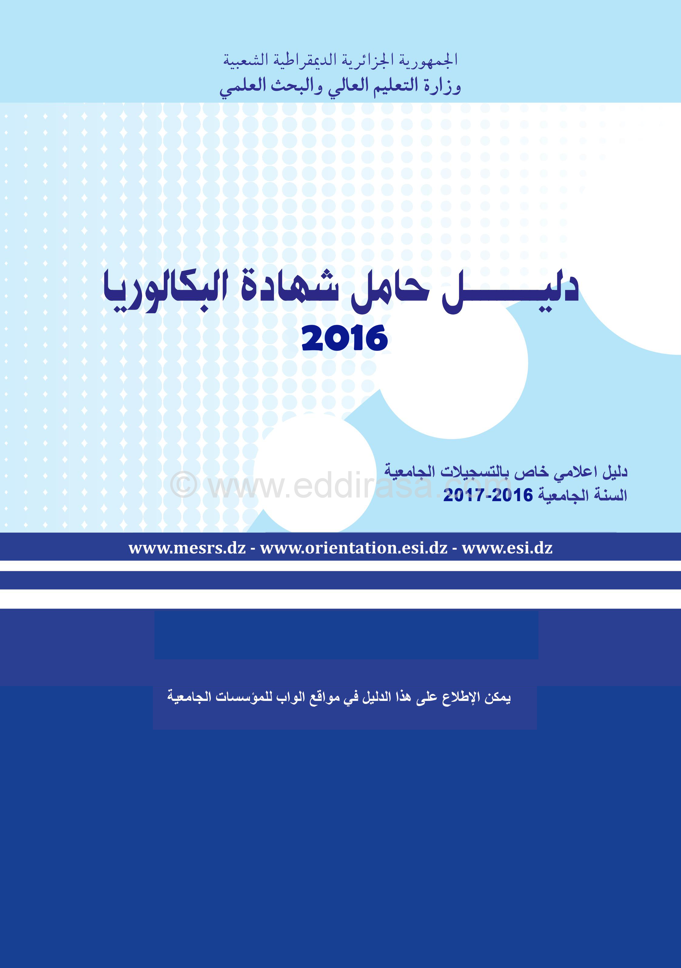 - دليل حاملي شهادة البكالوريا الجدد 2017، الذي يسمح لك بالتعرف على النظام الوطني للتعليم العالي ويشرح لك جميع الخطوات الواجب إتخاذها للتسجيل.